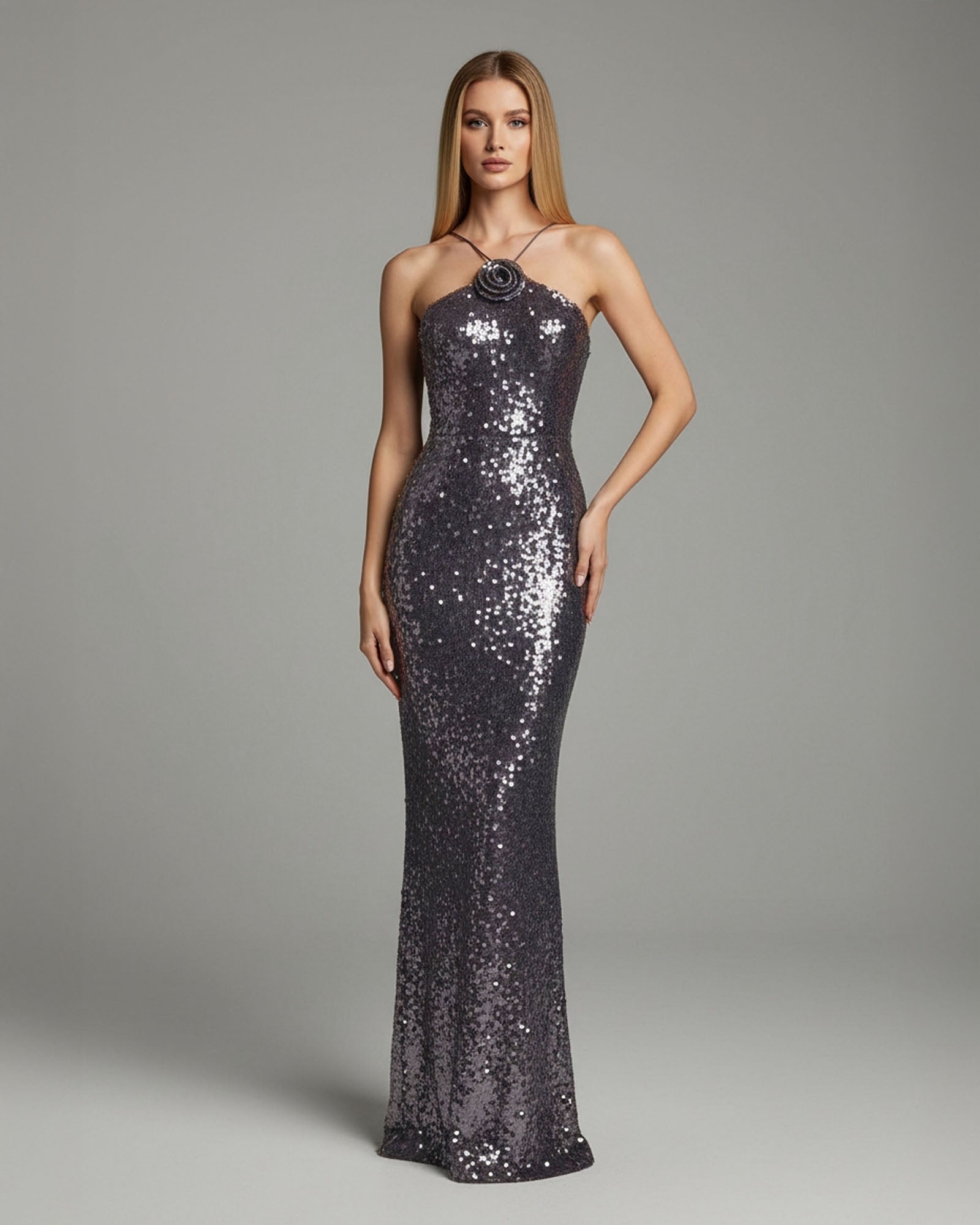 The AVANI dress is the kind of gown that feels almost liquid when it moves. Its surface is covered in subtle translucent sequins that shift with a soft, mermaid-like sheen — iridescent, dimensional, and impossibly captivating under evening light. The silhouette is long and sculpted, tracing the body before melting into a graceful maxi hem. It’s sleek, sensual, and shines like a sheet of stars. At the neckline, a delicate sequin rose creates a focal point, tied together by fine halter straps. This leads into an open back that laces together with barely-there ties.