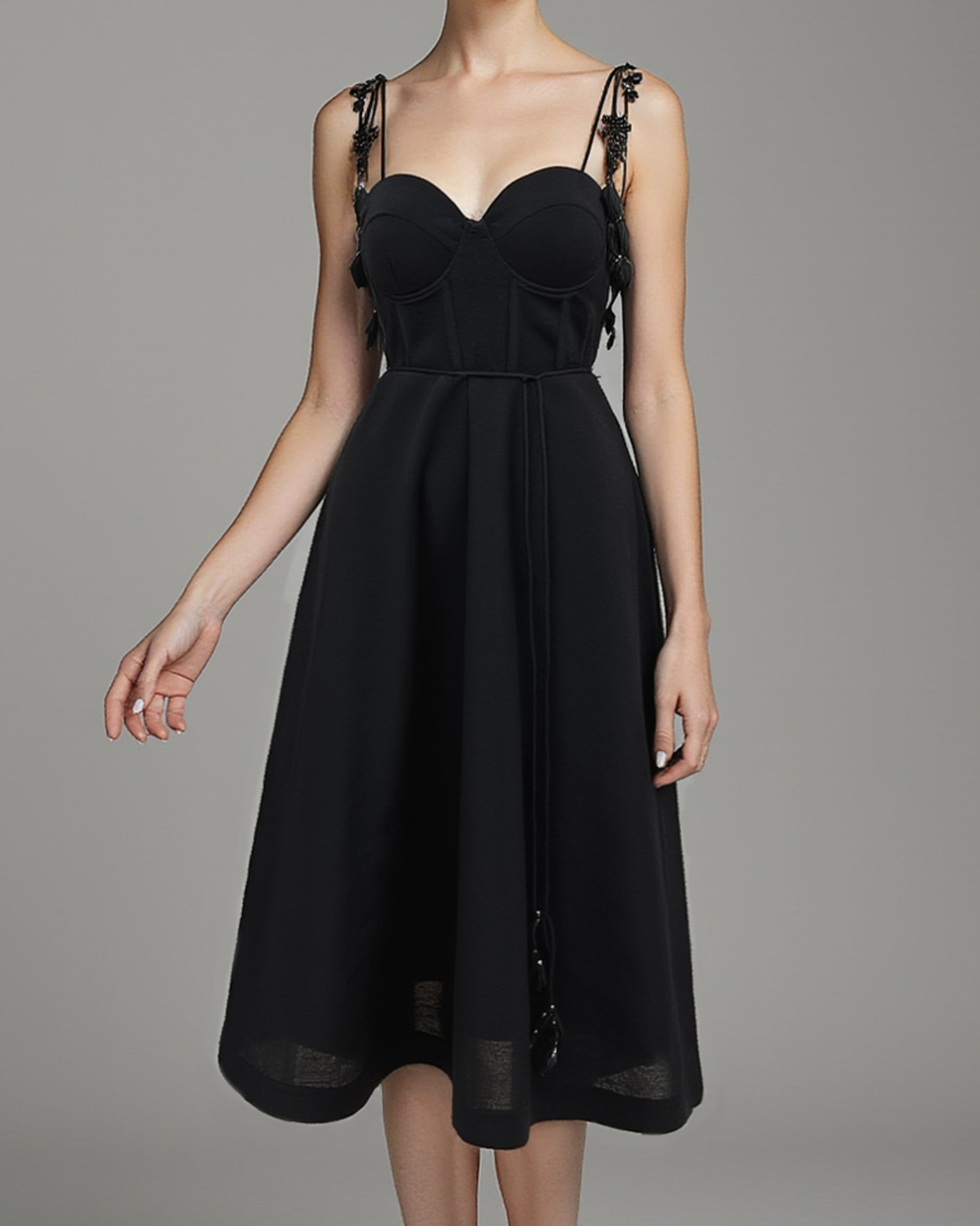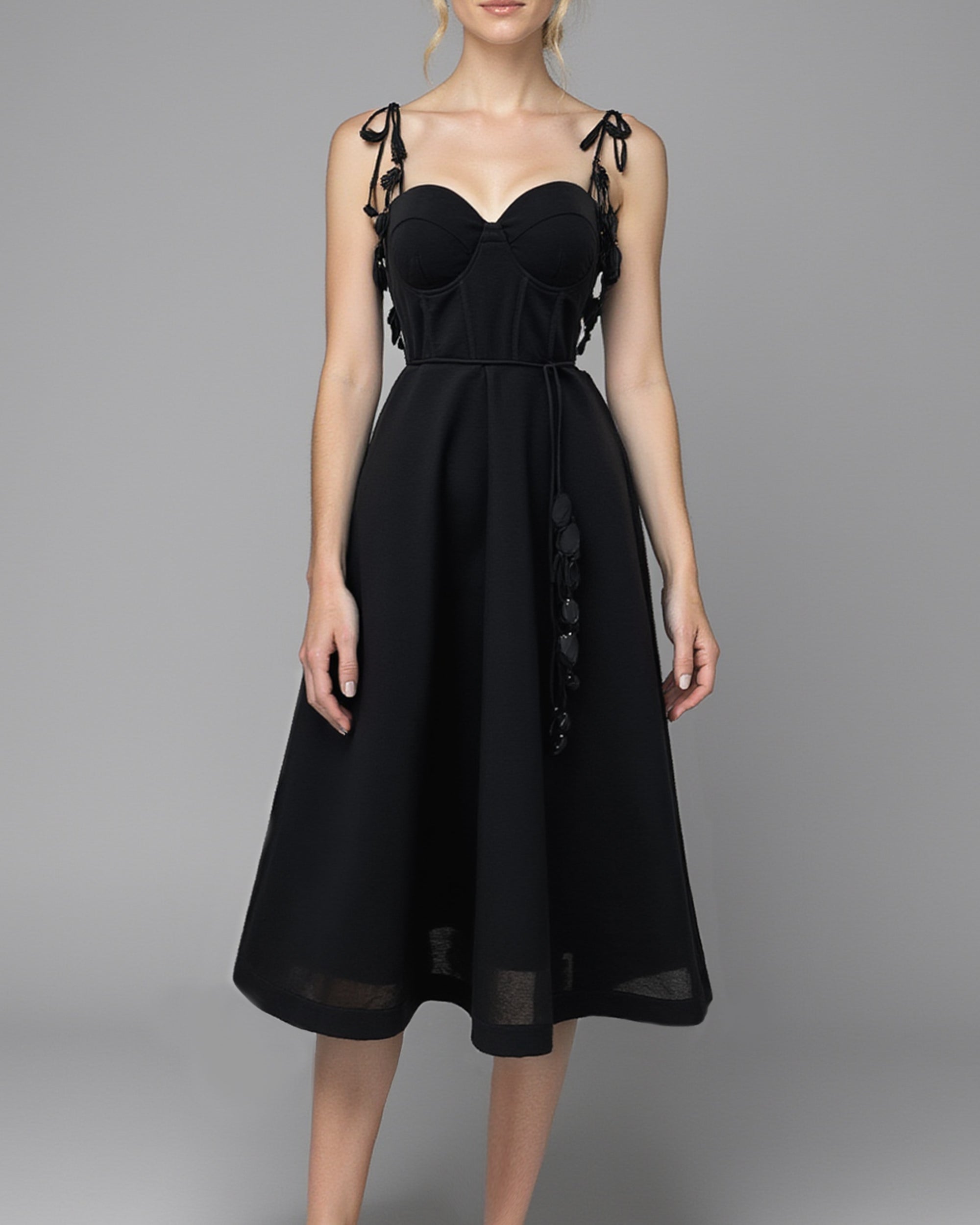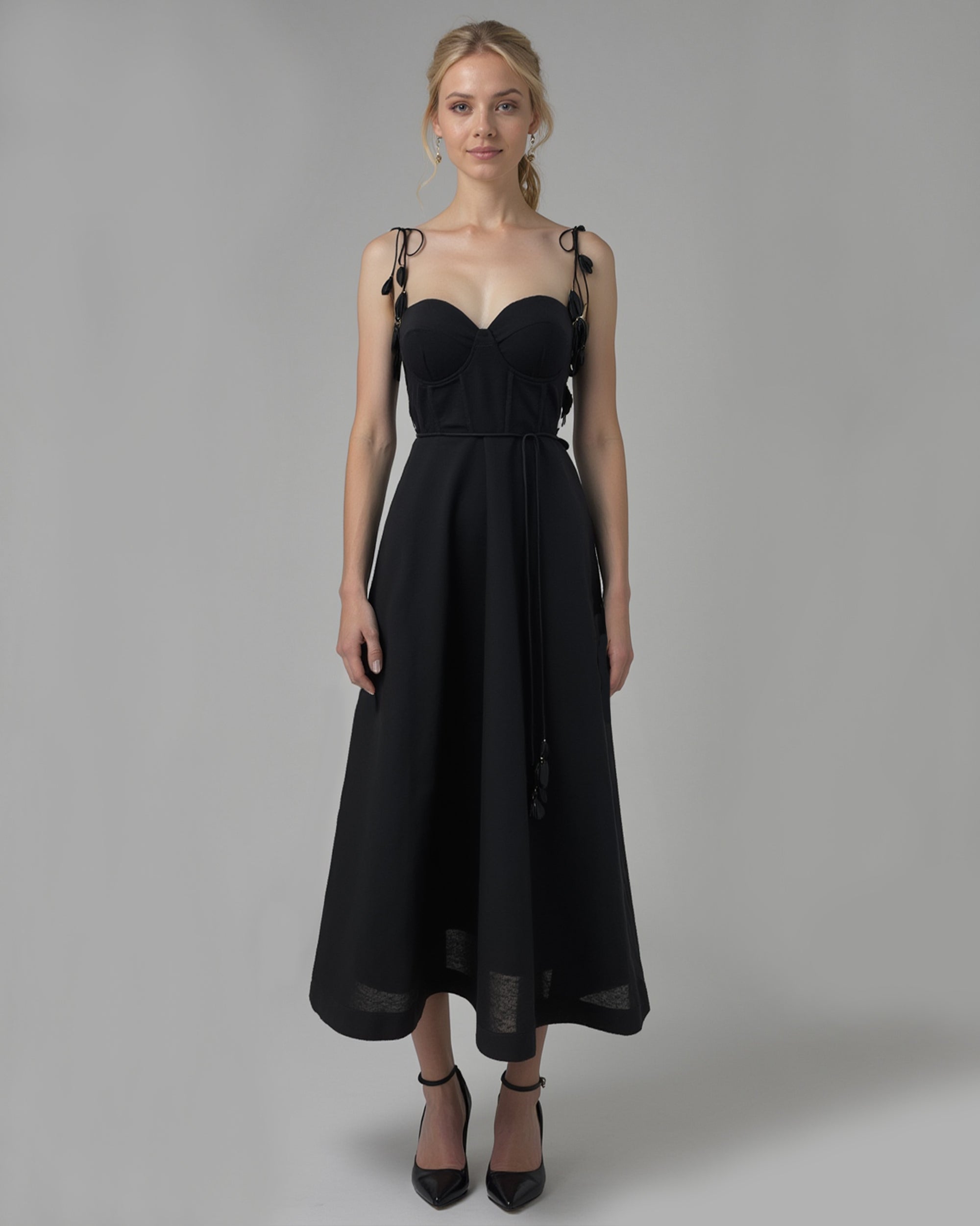 Like something out of a midsummer reverie, the EIRA midi dress is a nature-inspired blend of structure and softness. Delicate shoulder leaf appliqués trail along adjustable spaghetti straps, evoking the graceful charm of climbing vines. A structured corset bustier with built-in cups sculpts the figure, while a waist tie adorned with matching leaf appliqués adds a whimsical finish. Crafted in a double-layer design, the fit-and-flare A-line silhouette floats into a romantic midi length, making this dress an enchanting choice for any garden party.