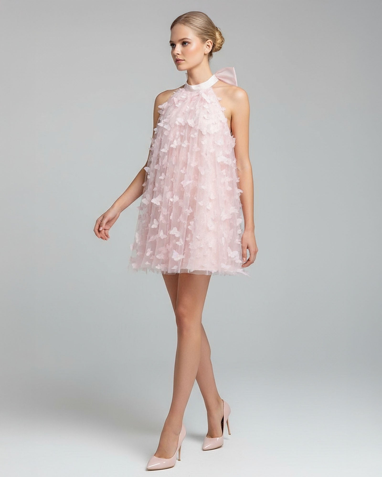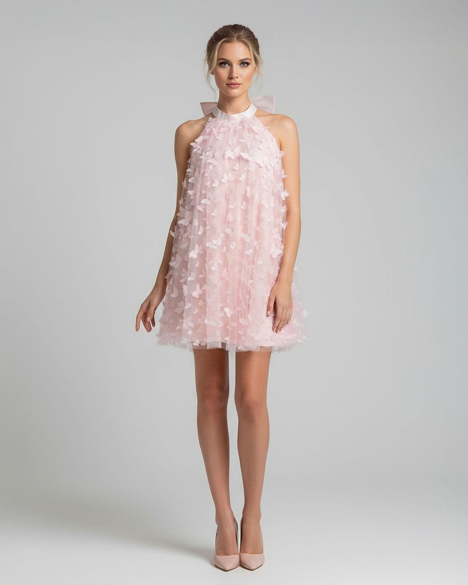Babydoll Butterfly Halter Mini Dress - Blush Pink