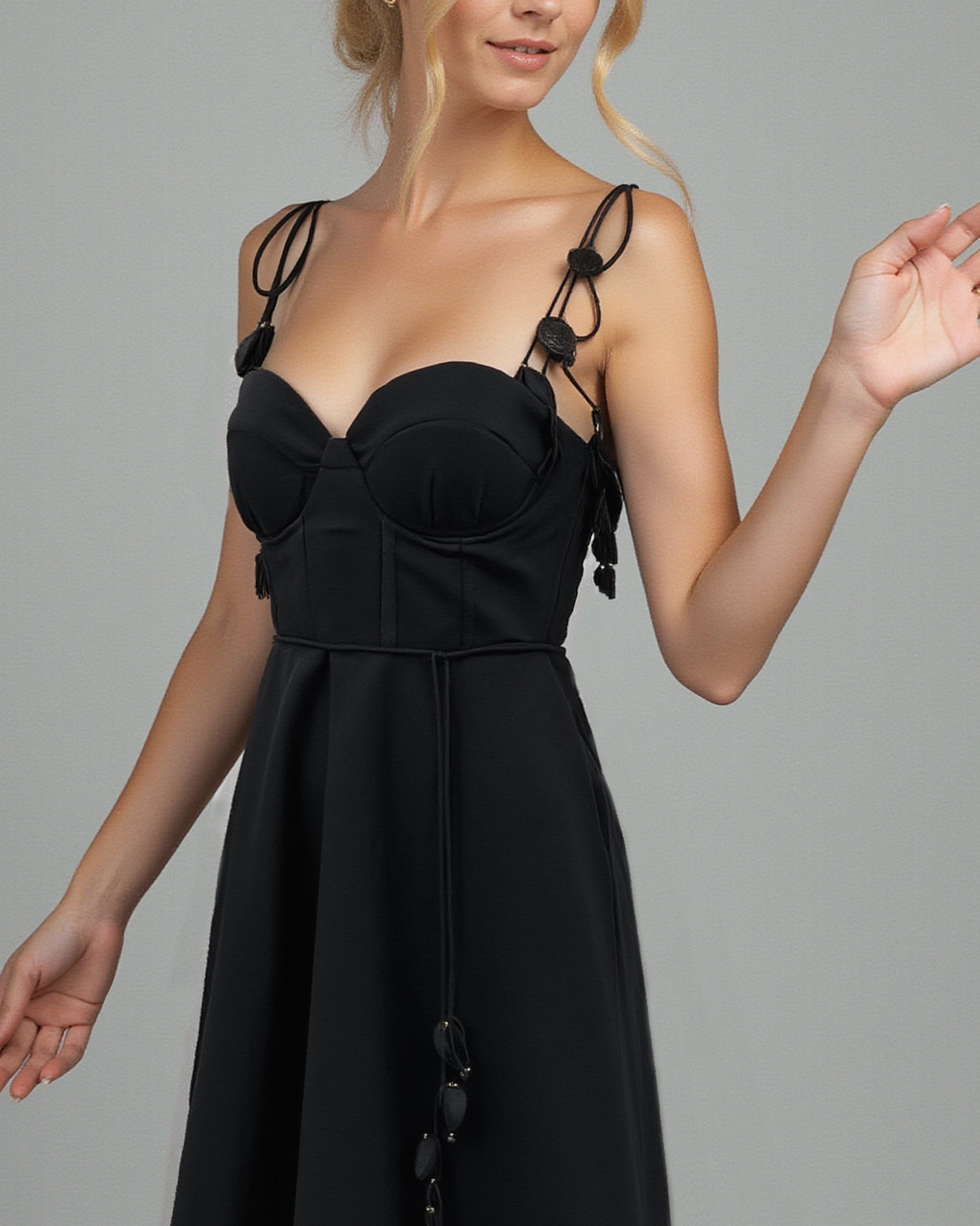 Leaf Appliqué Corset A-Line Dress - Black