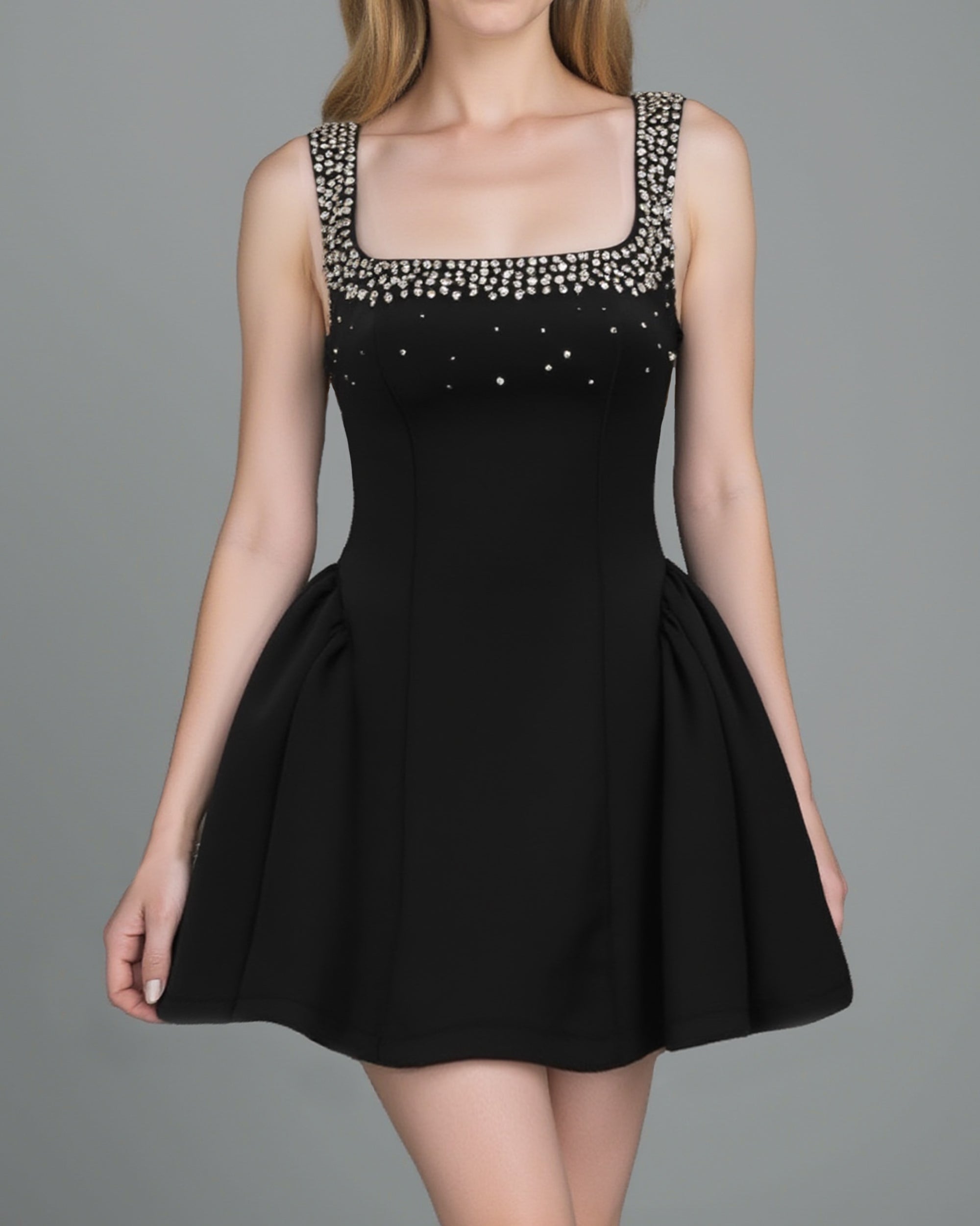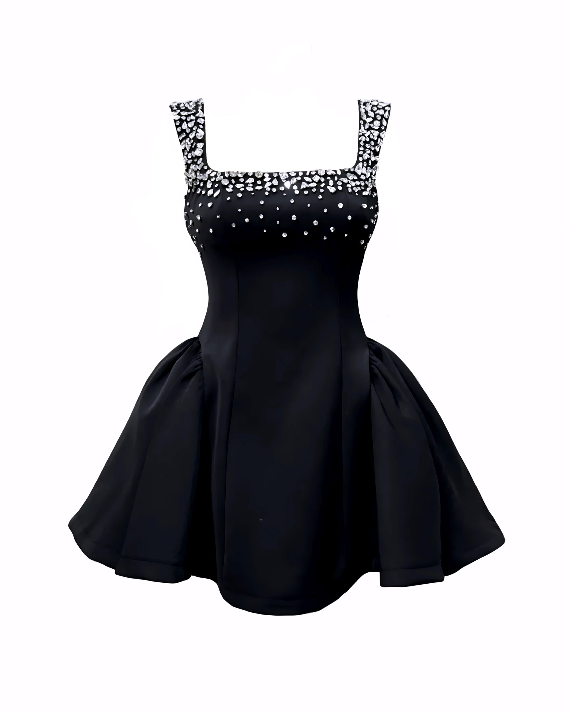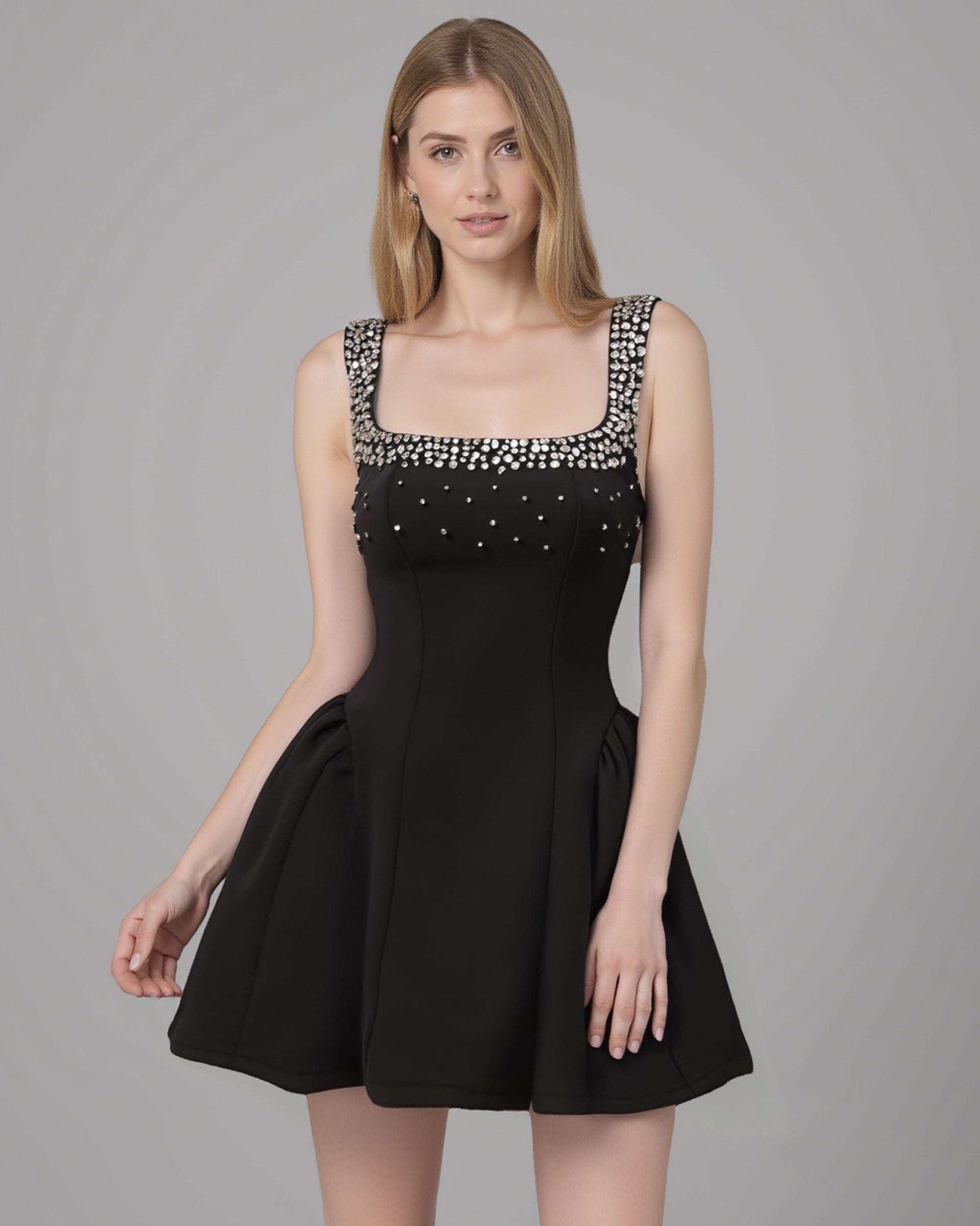 Diamante Embellished Flared Mini Dress - Black