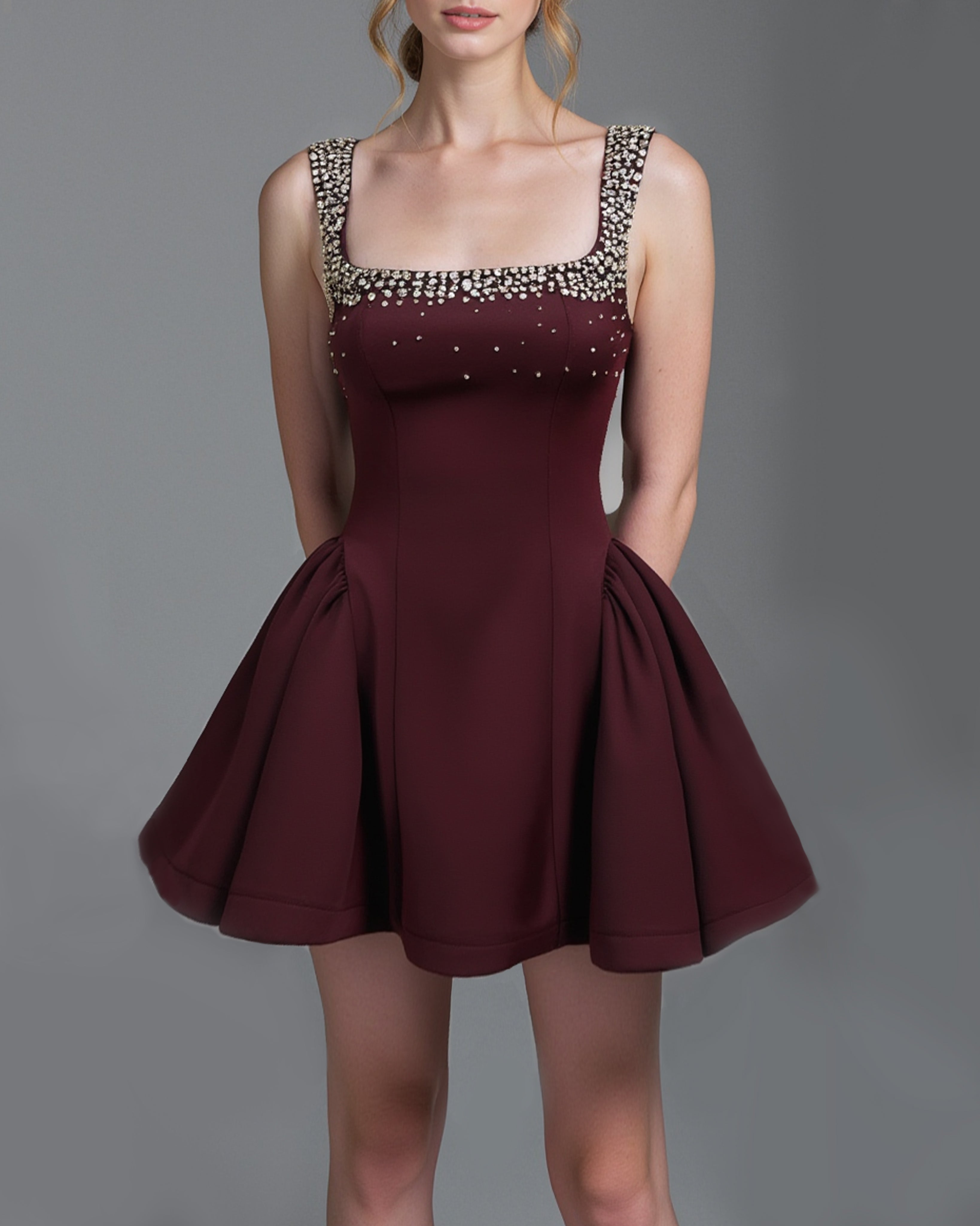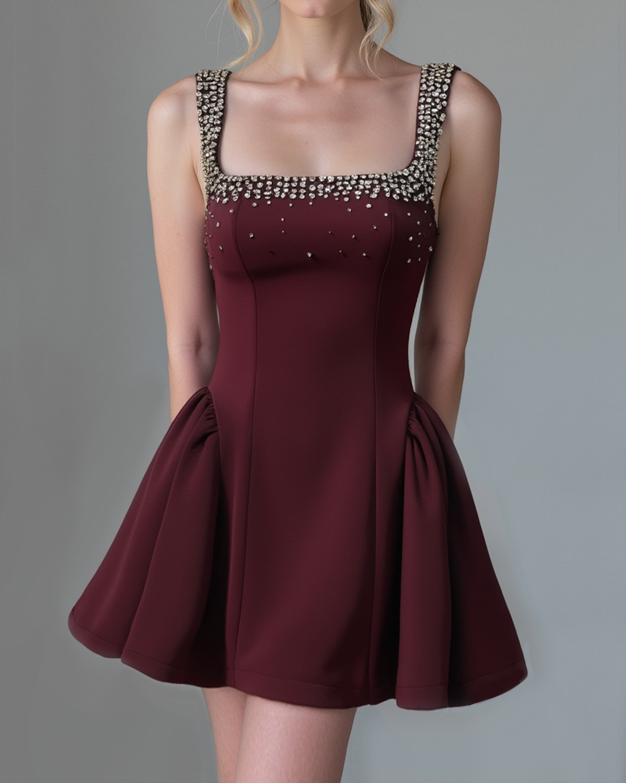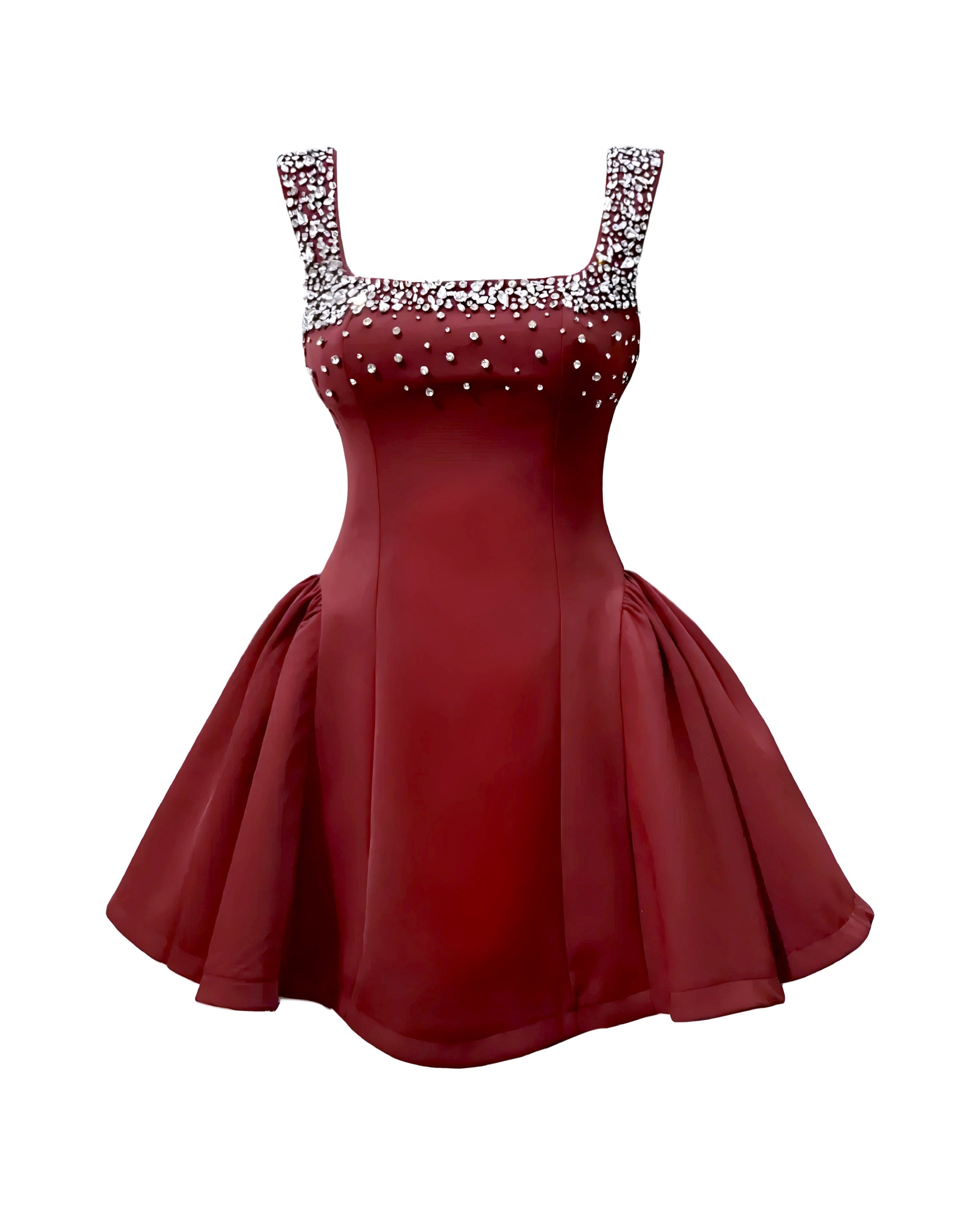 Diamante Embellished Flared Mini Dress - Wine Red
