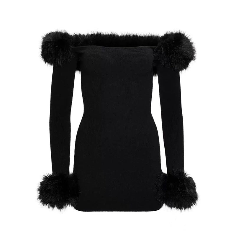 Song Zhiya Same Style Part Sweet And Spicy Dress Dress French One-Shoulder Fur Collar Pure Wants To Knitted Hip Dress