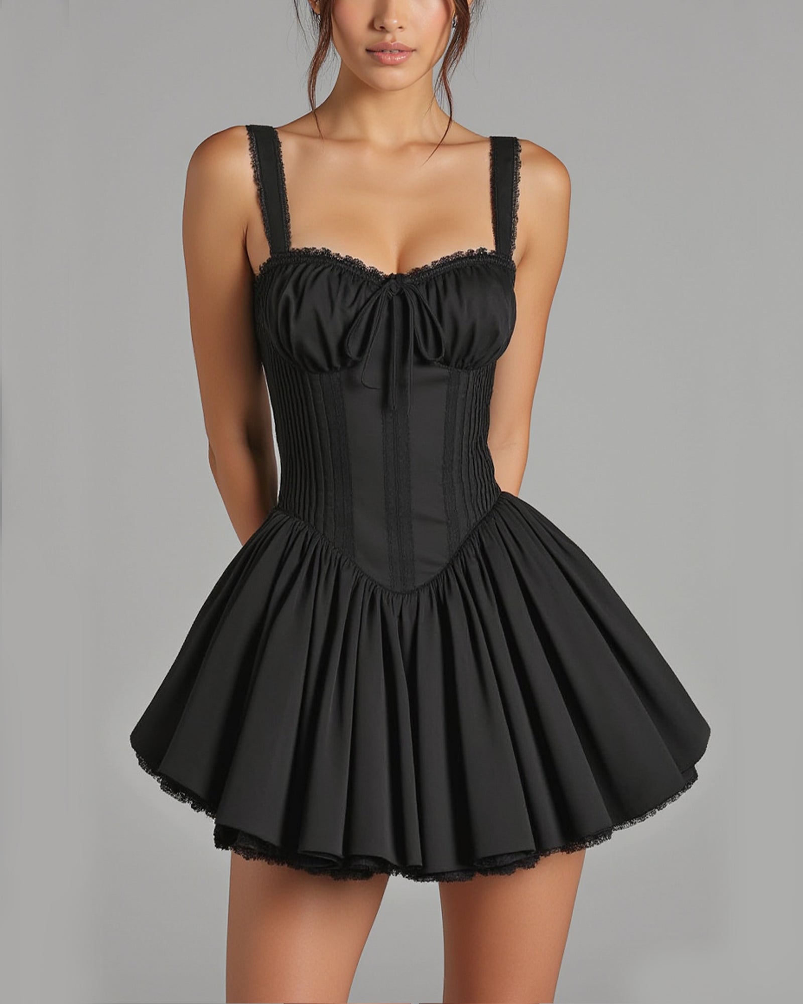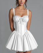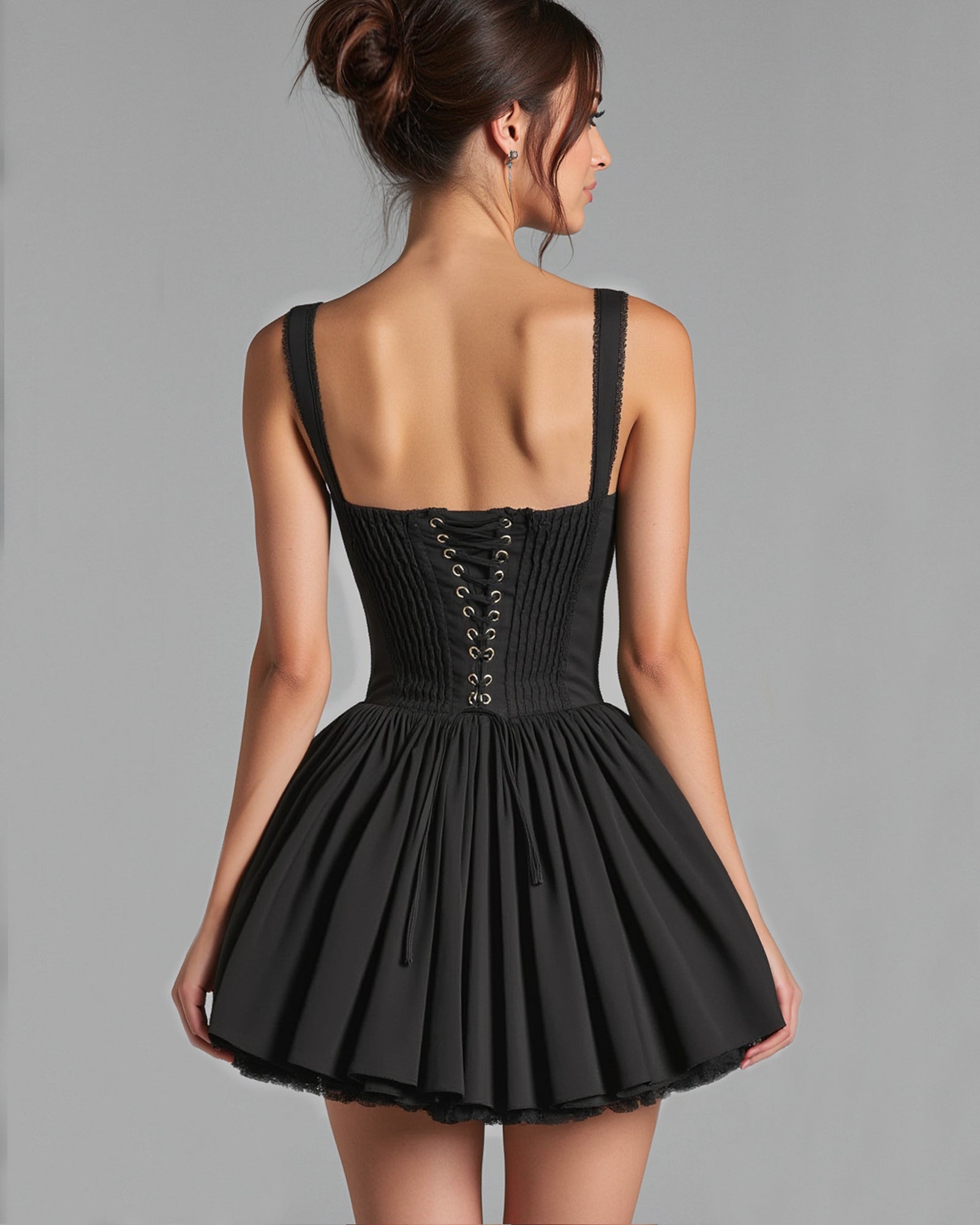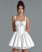 She’s all lace and layered secrets. The VICTORIA fit-and-flare mini dress is an architectural take on feminine summer dresses. With a sculpted lace corset and ruffled bustier kissed by ornate trim, this intricate design captures the essence of a modern-day heroine. Adjustable lace-up backing offers a custom fit, while the pleated ruffle skirt twirls with A-line grace. Wide lace-trim straps and voluminous inner layers add richness to movement. It’s not just a dress—it’s a love letter written in lace.