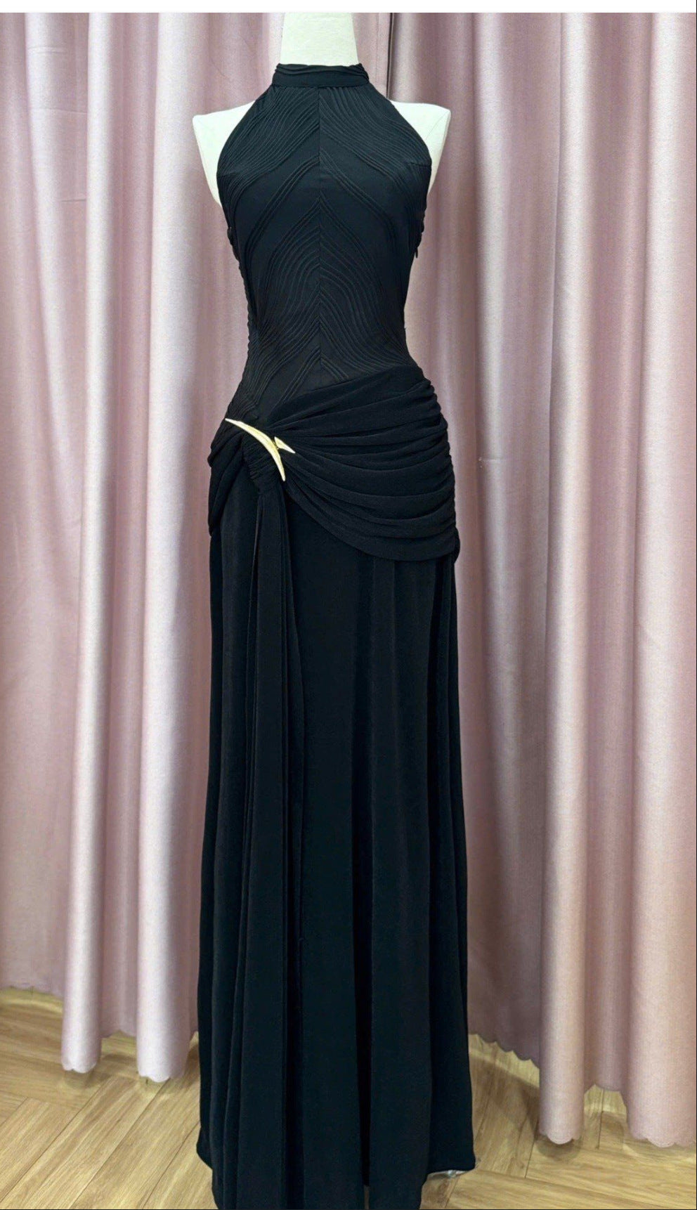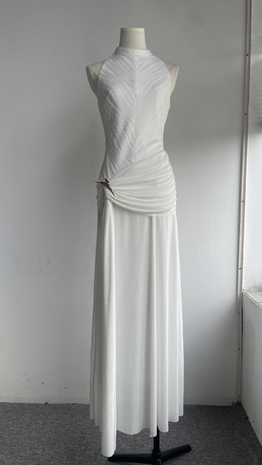 Waterfall Texture Dress, Socialite Style Halter Neck Floor-Length Dress, Solid Color Formal Dress For Women